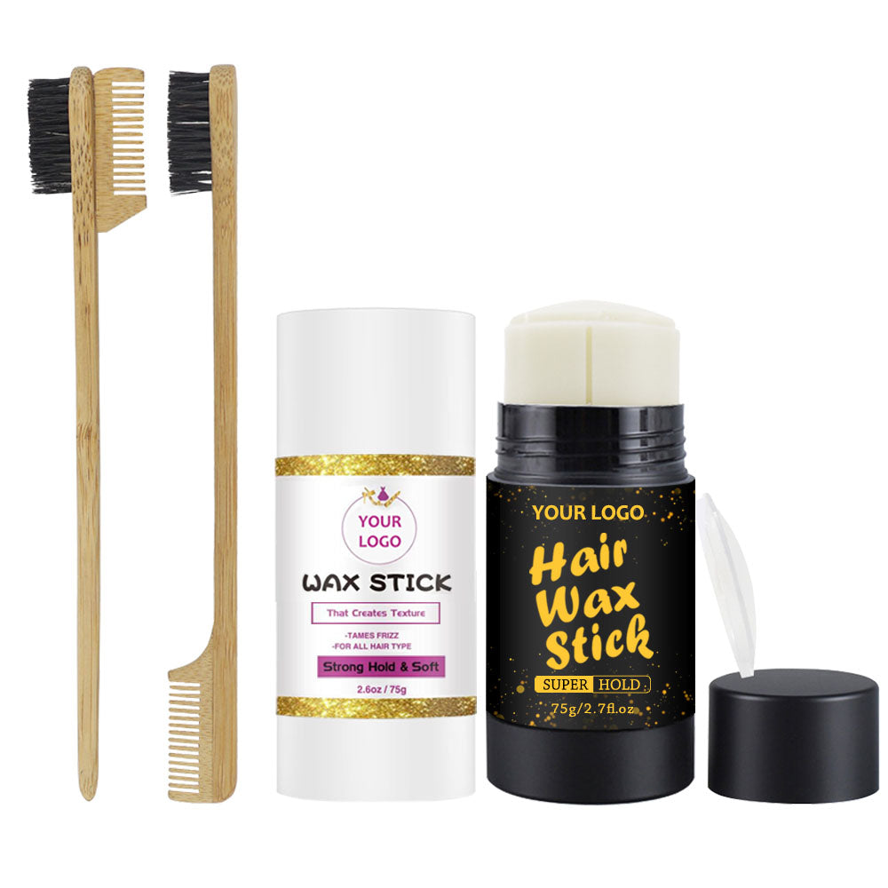 #This is a 75g edge control hair wax stick in matte plastic jar packaging, have 2 colors jar in black and white, it's portable size preferred for sleek finished style for hair and eyebrown, supports custom gift set with different brushes.