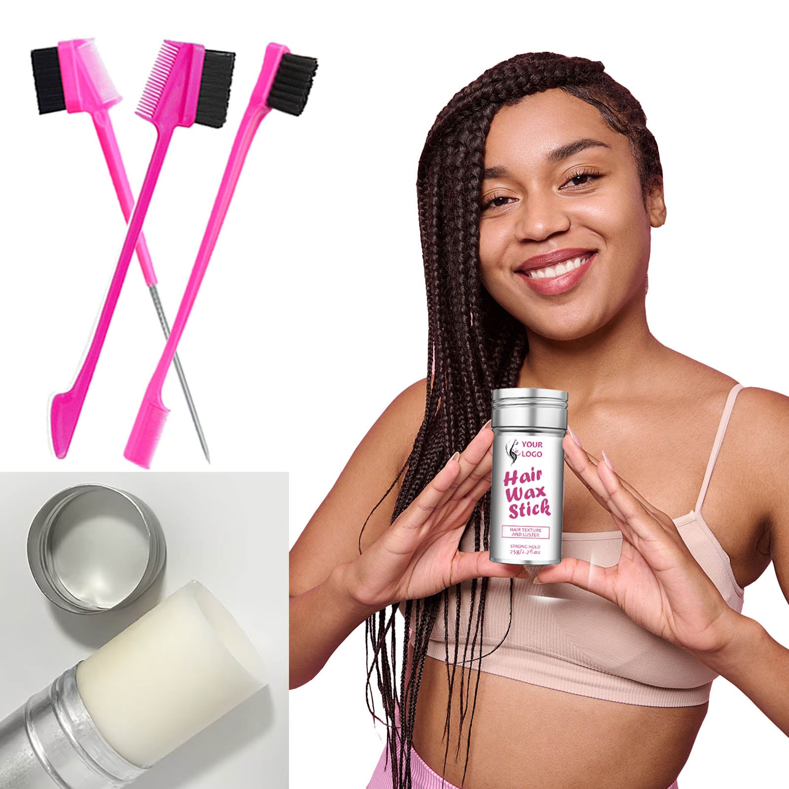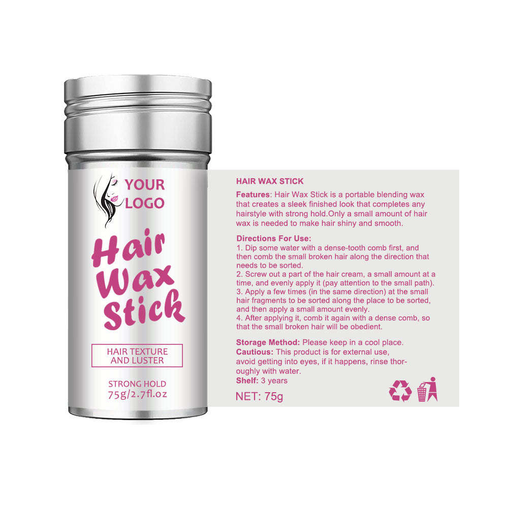 # This is a 75g hair wax stick in a melt jar packaging, perfect for eyebrows styling as well, and support custom kits with three different kinds of brushes.